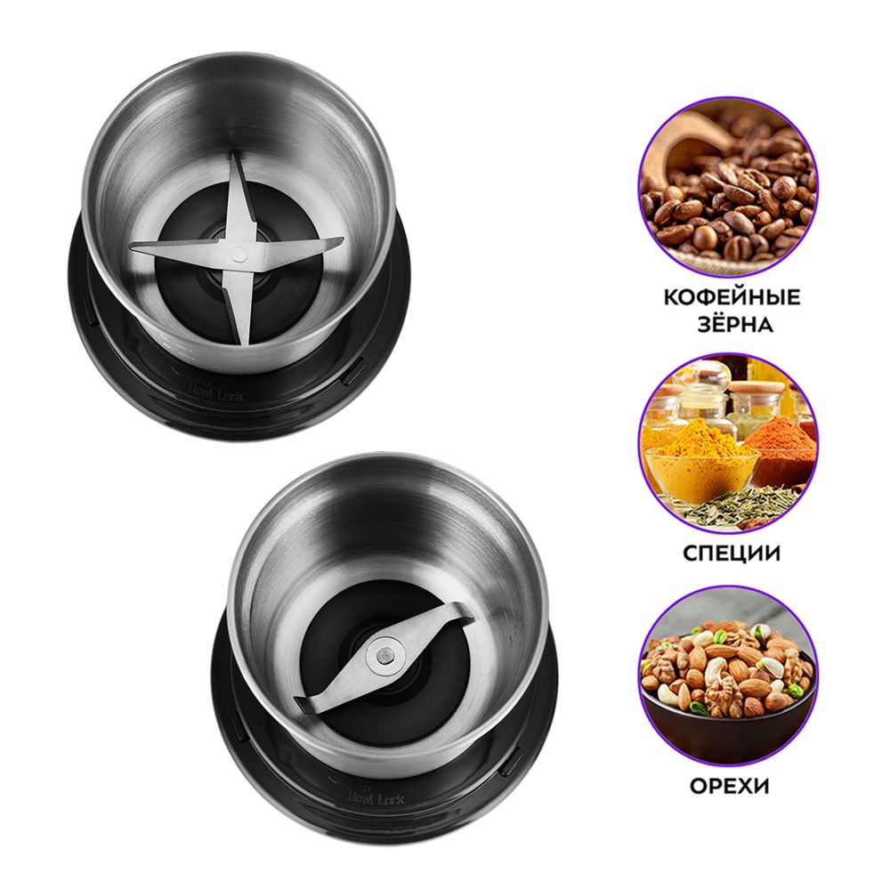 Кофемолка укомплектована двумя съёмными чашами: чашей для кофе и чашей для специй. В чаше для кофе установлен 2-лезвийный нож для эффективного помола зёрен кофе, а в чаше для специй – 4-лезвийный нож для измельчения. Ножи выполнены из нержавеющей стали.