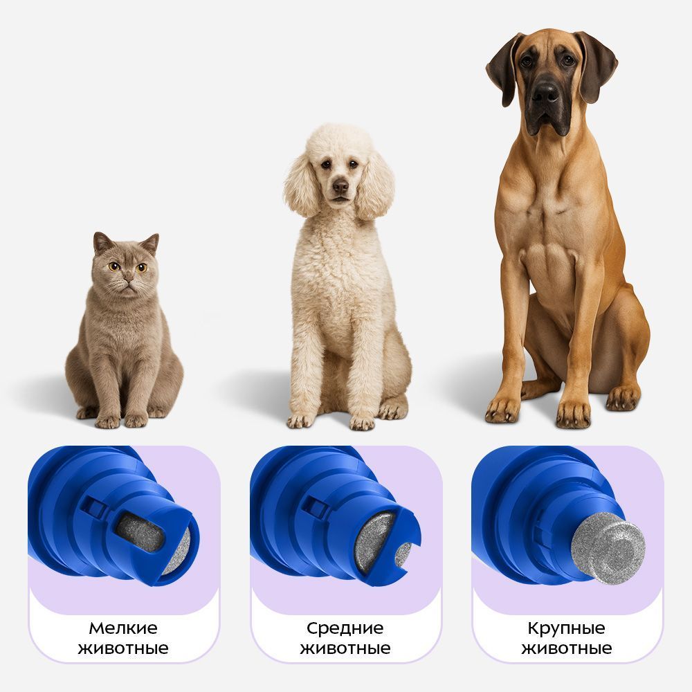 Гриндер для когтей КТ-9821 подходит для питомцев разных размеров и пород. В защитном колпачке предусмотрены две прорези разного размера: узкое и широкое отверстия предназначены для мелких и средних пород, без защитного колпачка – для крупных пород.