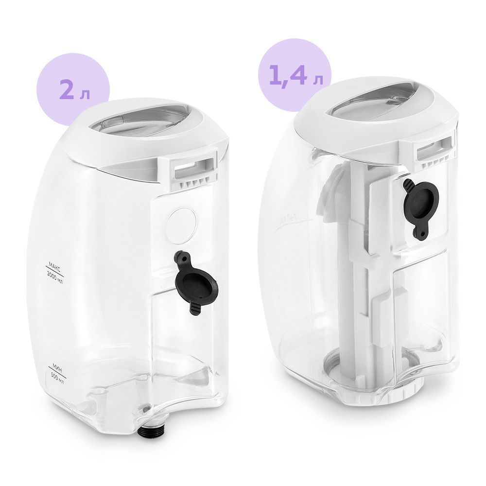 Для добавления воды у резервуара для чистой воды есть силиконовая заглушка. Крышка резервуара для грязной воды находится снизу, она съёмная и большая. У резервуара для грязной воды также есть силиконовая заглушка для удобного слива грязной воды.