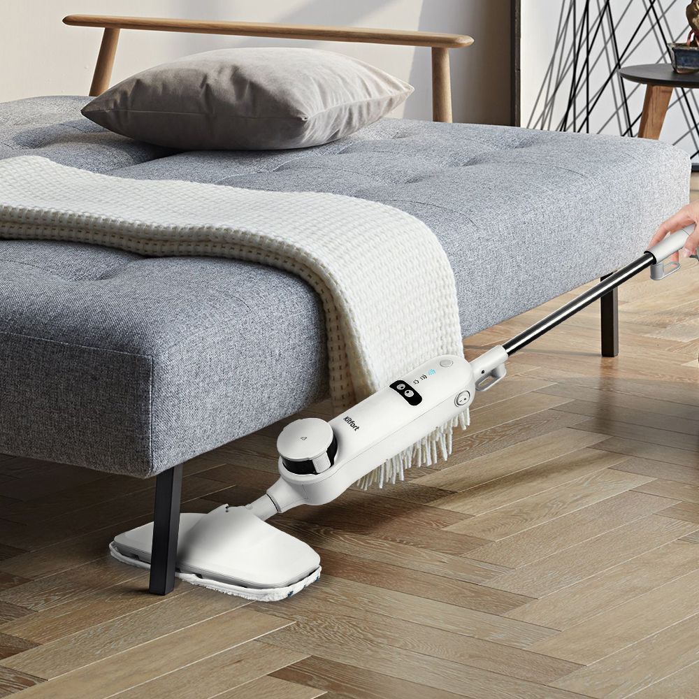 Паровая швабра обладает функцией вертикальной парковки и большим углом наклона при уборке, который поможет легко убирать пространство под мебелью.