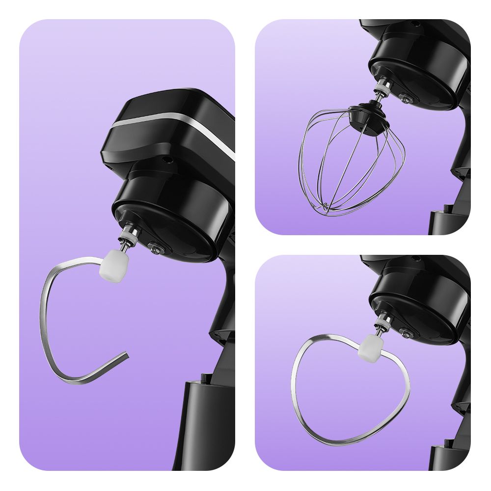 В комплекте есть три насадки. Венчик поможет взбивать яичные белки, замешивать жидкое тесто. Насадка для смешивания служит для негустых ингредиентов, приготовления пюре, кондитерских смесей. Крюк для замешивания подойдёт для замешивания густого теста.